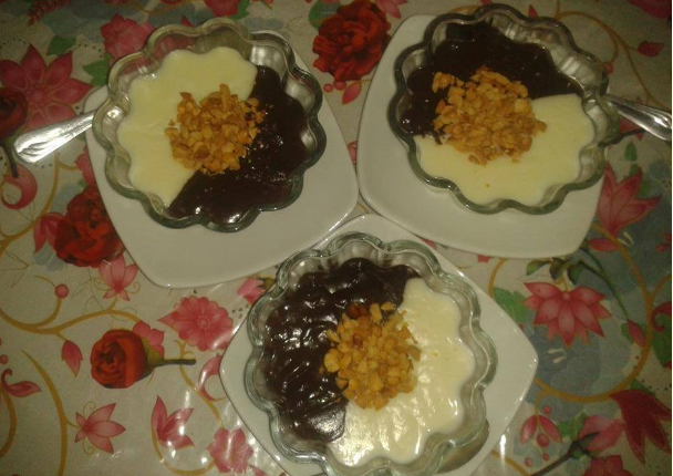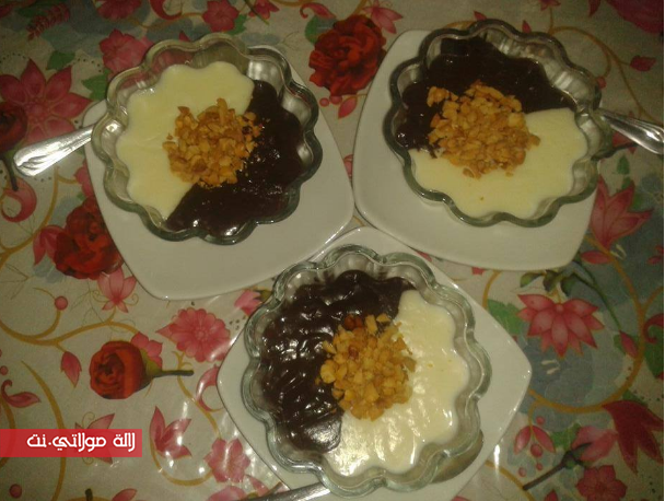 نصف لتر حليب ندوبو فيه 3 معالق كبيرة نشا+معلقة صغيرة فاني من بعد نقسموه على 2 يعني كل رابعة في كاسرولة و نديروهم في نفس لوقت على عافية مهيلة مع التحريك لمستمر حتى يولي لخليط كريمي و نديرو70غرام شكلاط أسود للكاسرولة الاولى و ننحركوه حتى يدوب الشكلاط و نزيدو للكاسرولة التانية 70 غرام شكلاط ابيض مع التحريك حتى يذوب الشكلاط و كانخوي في اناء التقديم شوي من لخليط الابيض و شوي من الاسود في نفس الوقت و نزينوه باللوز محمر ومهرمش و ندخلوه لتلاجة يبرد و بصحة و الراحة.