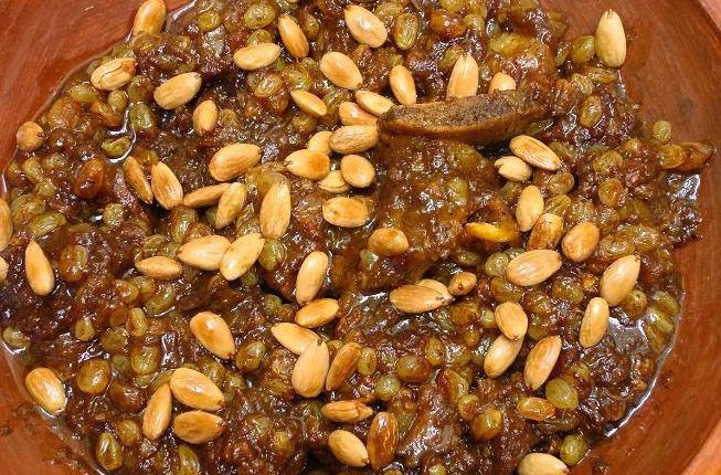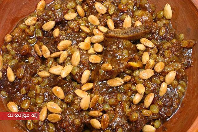 تغطى بالماء وتنضج مغطاة مع تحريكهامن حين لأخر. يزاد الماء في أثناء الطبخ إن اقتضت الحاجة لذلك. و من جة أخرى ينقى الزبيب ويشلل ويترك لينقع في النصف الباقي من خليط التوابل حينما يوشك اللحم أن ينضج، يزاد عليه العسل و الزبيب و القرفة، ترفع الطاوة عن النار. عندما يفصل اللحم بالأصابع في سهولة و تصير المرقة جد ثخينة، يرتب في صحن مستدير بأن تصفف قطع اللحم أولا ثم يجعل عليها اللوز والزبيب. ويصب من فوقها ومن حواليها ذالكم المرق المعسل.