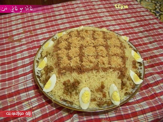 كناخدو طبسي نديرو طبقة الأولى شعرية لسقيناها بالمرقة ثم نضيف البصلة و البيض ثم نبلعوها بطيقة رقيقة ديال شعرية مسقية ثم نحطو فوقها الدجاج مفتت ثم طبقة رقيقة ديالشعرية لمسقية ثم اللوز ونبلعوها بشعرية لل فيها سكر كلاصي و نزينوها كبغينا أنا ديرت الفوق مربعات بالقرفة وعمرتهوم باللوز و في الجناب ديرت البيض و الزبيب مفور