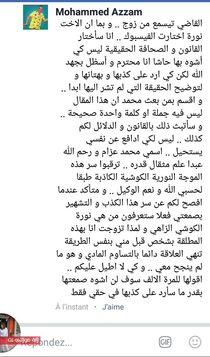 نشر الممثل الكوميدي محمد عزام المعروف بـ “بهلول”، على حسابه بالفايسبوك تدوينة مثيرة، رد من خلالها على تدوينة نشرتها زوجته الفنانة نورة كوشي خريجة برنامج “أراب أيدول” والتي ارتبطها بها قبل أشهر.