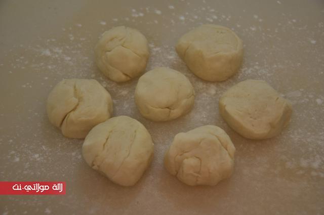نقسم العجينة 8 قطع متساوية ونغطيها بمنشفة .. ونبدا بالفرد لكل حبة ورقها حتى تصبح رقيقة بسمك ربع سم