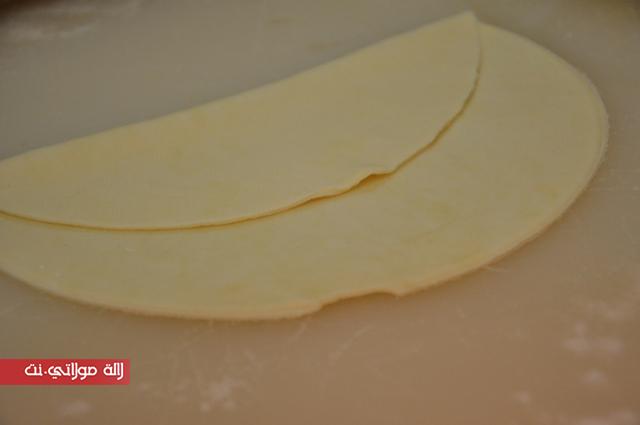 ايضا يمكن تقطيع العجينة بشكل دوائر صغيره اذا كانت التورتيلا مقدمه كمقبلات بالحفلات او بالبوفيهات المفتوحه ..