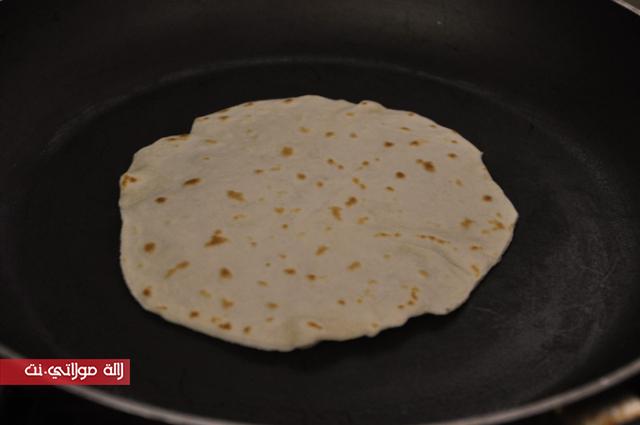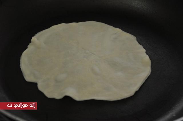 نضع العجينة بدون زيت على المقلى .. ونلاحظ انتفاخات بسيطة بالعجينة .. نقلبها على الوجه الاخر .. قد تنتفخ قليلا