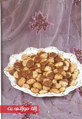 عند اخراجها من الفرن يغمس نصفها الاخر في الشوكولاطة المدابة مع الزيت
