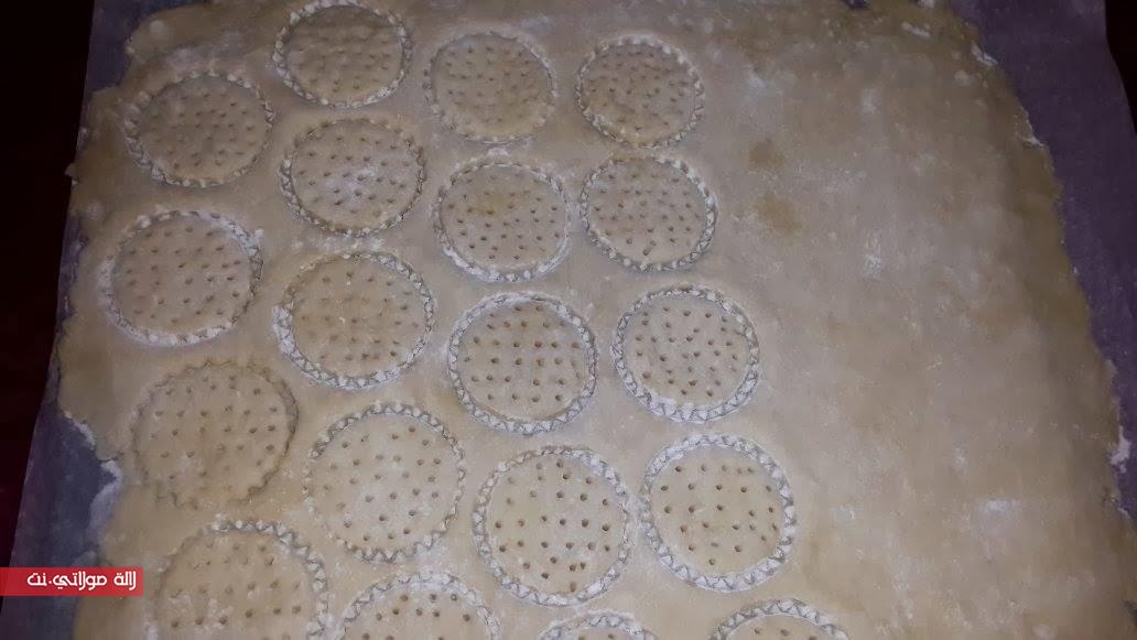 ثم نأخد قطاعة دائرية ونقطع العجين وبواسطة كوردون نعمل ثقوب في البيسكوي باش ميتنفخش ثم إلى الفرن حتى يطيب