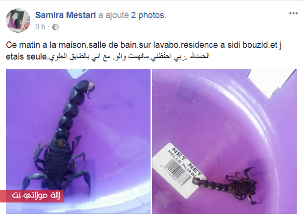 نشرت سميرة مستاري طليقة الممثل المغربي هشام بهلول على حسابها بالفايسبوك، صورتان كشفت من خلالهما أنها عاشت الرعب بمنزلها بمنطقة سيدي بوزيد، بسب عثورها على عقرب.