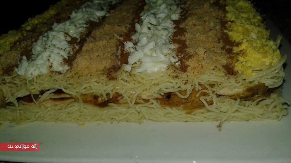 نخلي الدجاج يطيب تم نضيف القرفة ومعلقة سنيدة والزبيب وخديت الطبق حطيت عليه اطار مربع وحطيت السفة تم الدجاج ونحولو نقدوه في