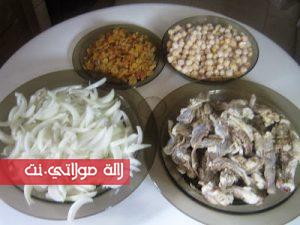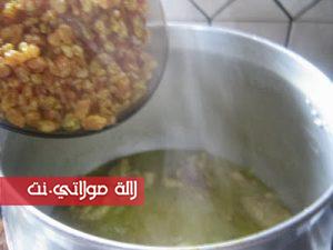 نقطع أطراف الديالة أو القدّيد بعدما نفزكٌها في الماء ليلة كاملة ، 4 بصلات مقطعين شرائح ، الحمص مفزكٌ ، الزبيب مغسول حتى هو مفزك في الماء ، كأس العنبة من الزيت ، قزبور و معدنوس مربطين ، خرقوم ، إبزار ، سكنجبير، ملح+ خضر الكسكس المراكشي .