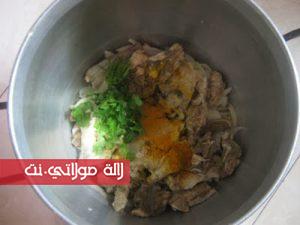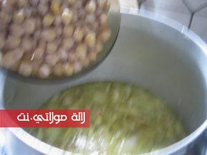 نعمل أطراف الديٌالة في برمة الكسكس و نعمل عليها جميع التوابل ونخليوها تتقلٌى شوية من بعد نعمل فيها الماء الكافي ندهن الكسكس بزيت الزيتون ونرشه بالماء الكافي ونبسبسوه لما تغلى الطنجرة نعمل فيها الحمص يطيب.