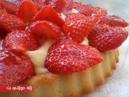 في إناء اخر يضرب بياض البيض جيدا ثم نضيفه إلى الخليط السابق ونضعه في إناء الكيكة بعد ذلك نقسم الفريز إلى قسمين ثم نضعه على وجه الطورطة ترش ب 50 غ من السكر المتبقية مع القرفة تطهى في فرن معتدل الحرارة لمدة 30 دقيقة .