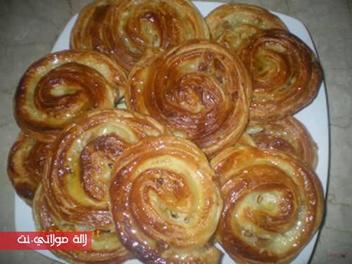 نبسط العجينة المورقة بالمدلك وندهنوها بعجينة الزيتون والتون ثم نلفها على نفسها للحصول على شكل (رولو) نقطع منه دوائر متساوية تظهر من داخلها حشوة الزيتون بشكل حلزوني…