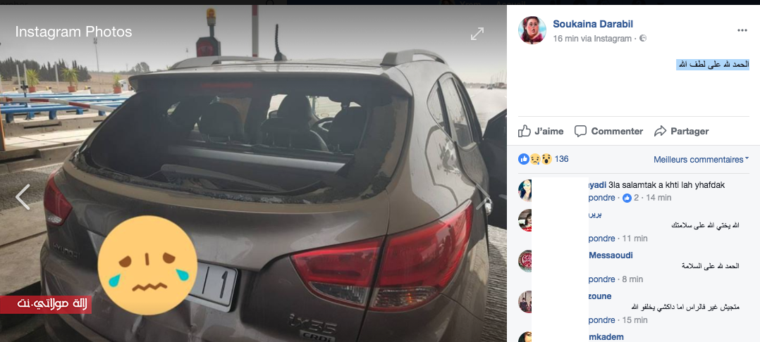 و نشرت سكينة درابيل عبر حساباتها الشخصية على المواقع التواصلية صورة لسيارتها بعد الحادث قائلة « الحمد لله على لطف الله ».
