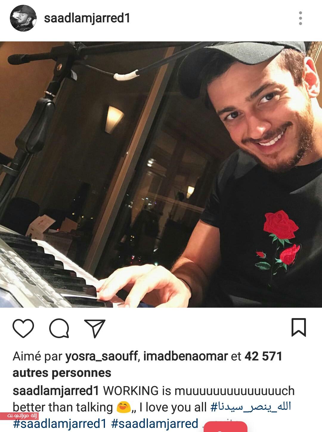 شارك الفنان المغربي سعد المجرد عبر حسابه الخاص على موقع التواصل الاجتماعي « انستغرام » صورة له وهو في أحد استوديوهات تسجيل الأغاني.وأرفق « لمعلم » الصورة بتعليق يوحي بأنه يستعد لتسجيل عمل غنائي جديد حيث قال « العمل أفضل بكثير من الكلام ».