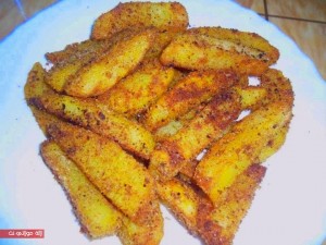 ناخذ البطاطس ونقوم بتقشيرها وتقطيعها الى اصابع وسلقها نصف سلقة في ماء مملح ونصفيها ونتركها تبرد.