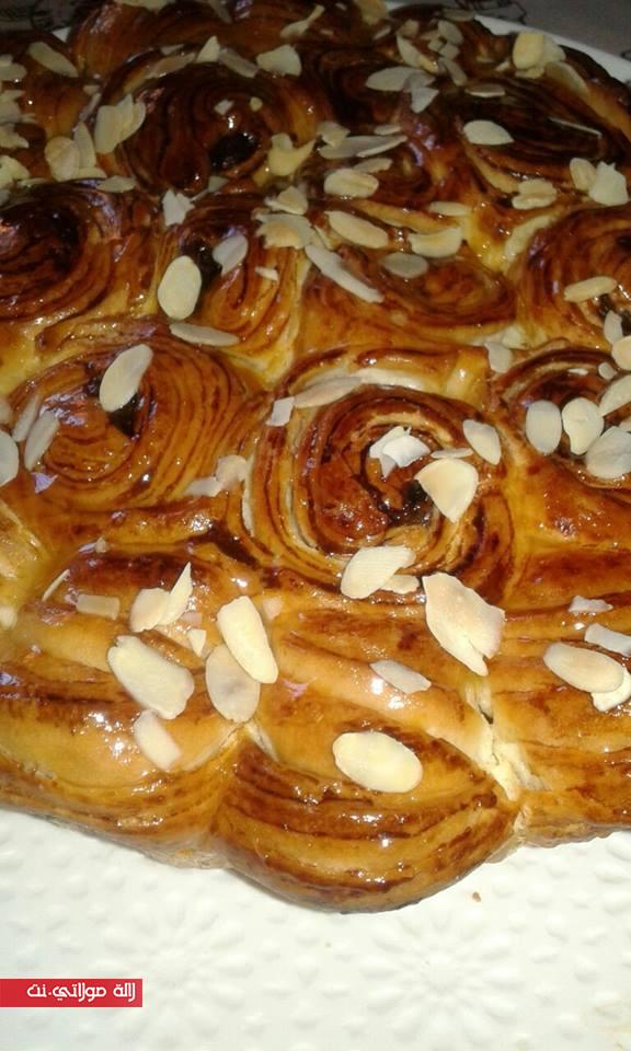 نخلط الكل يكون سائل ونغطيه بالبلاستيك الغذائي حوالي 10 دقائق أو حسب الجو و نضيف له نصف كأس زيت المائدة و نجمع ب 300 غ فرص وندلك جيدا ، ثم نشكل كويرات ونضع واحدة فوق الأخرى مذهونة بزبدة التوريق ( بحرارة المطبخ) حتى نكمل جميع الكويرات و ندخلها للثلاجة مدة 15 دقيقة ثم نطلقها بالمدلك و نقطعها مثلثات مثل الكرواصة ( 16 مثلث) ونحشيها بالشكلاط ونقطعها على نصفين و نعملها في مول مدهون ومرشوش بالطحين ، الجهة المقطعة تكون في حافة المول ، نتركها تخمر جيدا و ندهنها بالبيض و القهوة السريعة الذوبان .