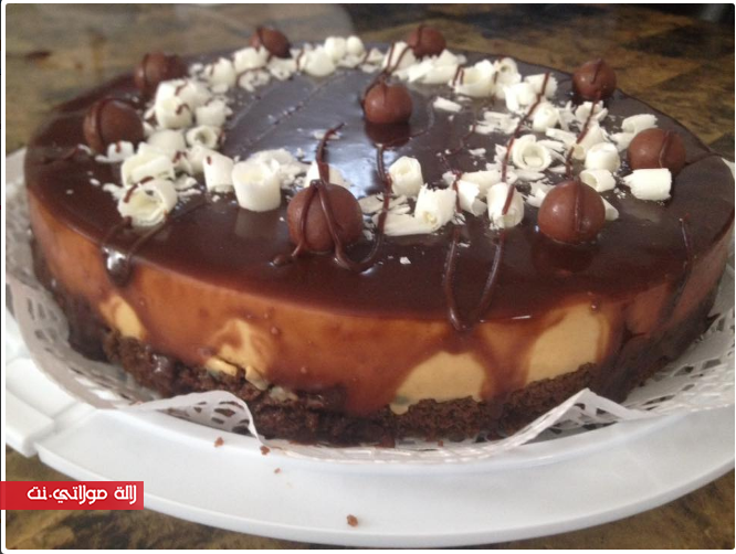 والتانية كبيت عليها الكاناش وزينت بكرات الشكلاطة وخطوط من الشكلاط الاسود والشكلاط ابيض فالوسط.