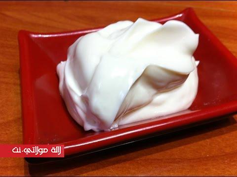 نضع المكونات في الخلاط و نطحن جيدا ثم نضيف الزيت تدريجيا حتى الحصول على مايونيز كثيف و ينسم بالمعدنوس أو السيبوليت مقطع .
