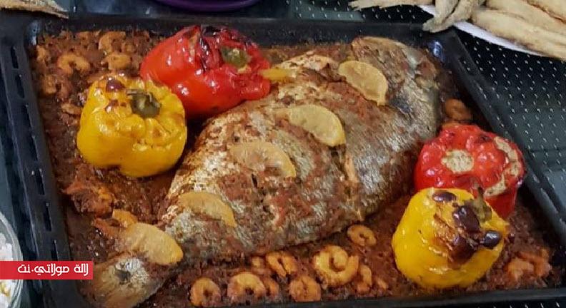 في اناء الفرن نفرش صلصة الطماطم مضاف لها الشرمولة المتبقية و القيلل من الزيت البلدية ، ثم توضع السمكة في الوسط مزينة بشرائح الحامض و خيط رفيع من الزيت البلدية ، ثم توضع في الجوانب الفلافل معمرة بالروز ويغطى اناء الفرن.