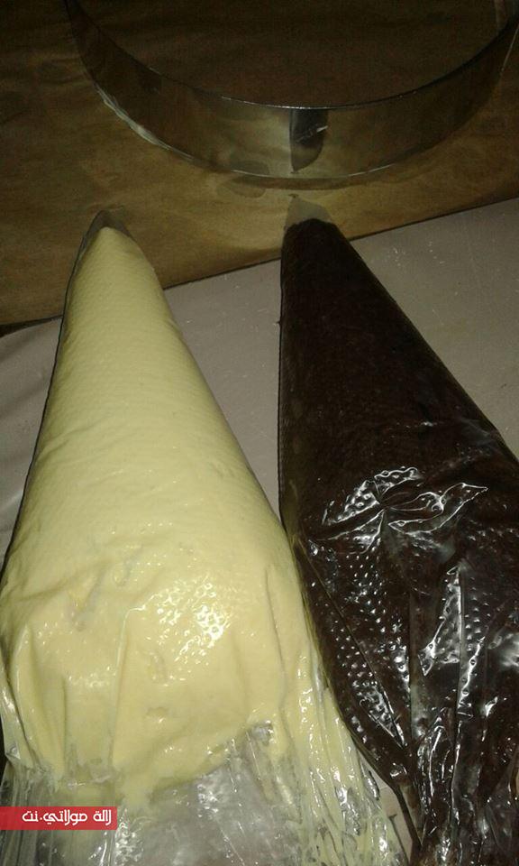 يقسم الخليط بالتساوي ثم نضيف للخليط الأول 50 غ مايزينا والثاني 50غ كاكاو.