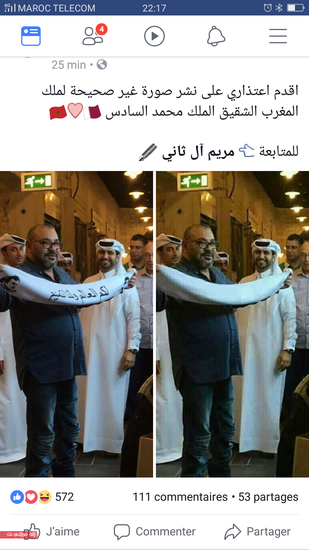 وأعرب المسؤول القطري عن أسفه للصورة المركبة والتي تظهر جلالة الملك وهو يحمل وشاحا أثناء إحدى الزيارات في منطقة بالدوحة.