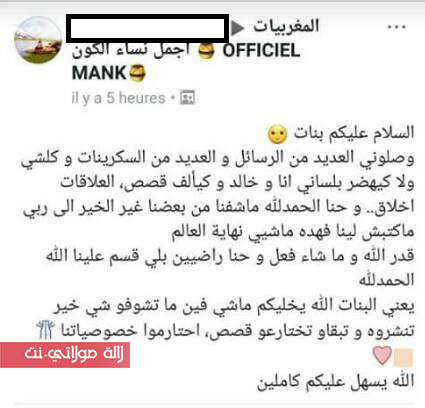 بعد ساعات من تناقل خبر طلاق المقرئ خالد رياض الملقب بـ “البوكوص”، تناقلت العديد من الصفحات بمواقع التواصل الاجتماعي، رد زوجته السابقة في تفاعلها بإحدى المجموعات الفيسبوكية والتي طالبت من خلالها جميع النشطاء باحترامها واحترام زوجها السابق.