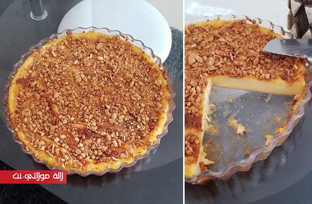 في مولينكس ديري البيض ، سنيدة ،الزيت ، كاس حليب بارد ، وكريم باتسيير هي الاخيرة باش متلصقش ليك في قاع مولينكس وضربي مزيان حتى يتجانس الخليط ، من بعد داك الحليب لي باقي ديريه فوق عافية مهيلة حتى يدفا وبداي كتكبي فالخليط شوية بشوية وانتي كتحركي متحبسيش من التحراك حتى يعقد الخليط وكبيه فشي مول مدهون غير بالزيت ودخليه للفران يكون مسخن من قبل ديريه نيشان بلا ماديري bain marie وخليه نصف ساعة حتى يبان ليك الوجة ديالها دار قشرة قهوية غتعرفيه طاب ، من بعد دهني الوجه بالعسل ولا لكليكوز وزيني باللوز او الكوك او لي بغيتي