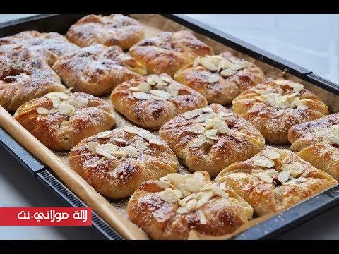 نقطعوا 2 تفاحات مقطعين + م ص سكر + م ك قرفة + م ك الزبدة ونشحروهم وتترك جانبا حتى يبرد الحشوة الثانيةناخذوا 2 بنانات مقطعين + شوي قرفة + شوي سكر ناخذوا الكويرة العجين نسرحوها بالزيت وزبدة ونرشوا الدقيق وتلوى على ربعة بحال مسمن عادي حتى نكملوا كلشي ثم ناخذوا المسمنة الأولى نطلقوها شوي نحطوا شوي ديال التفاح ونسدوا بحال الظرف ثم نفس الشئ للبنان ونسدوا ناخذوا بيضة + شوي الحليب نخلطوهم وندهنوا آلمسمن ونرشوا اللوز رقائق وتطهى في الفرن لما يخرجوا من الفرن