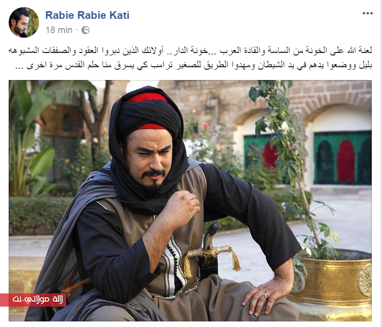 وكتب القاطي في تدوينته: ” لعنة الله على الخونة من الساسة والقادة العرب …خونة الدار.. أولائك الذين دبروا العقود والصفقات المشبوهه بليل ووضعوا يدهم في يد الشيطان ومهدوا الطريق للصغير ترامب كي يسرق منا حلم القدس مرة أخرى …”.