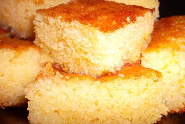 في المقلاة الثقيلة مدهونة بالزبدة و مرشوشة بالسميدة نسكب الخليط و ندخلها تطيب في الفرن .