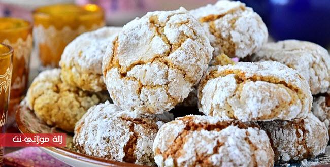 تشكل كرات صغيرة كحجم حبة مشمش، ثم تغطى بالسكر الناعم، ثم ترص في صينية فرن .