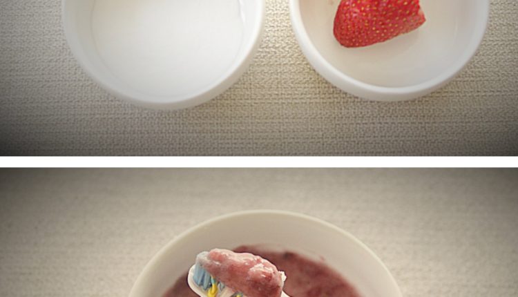 تخلط الفراولة المهروسة مع صودا الخبز للحصول على خليط متجانس.