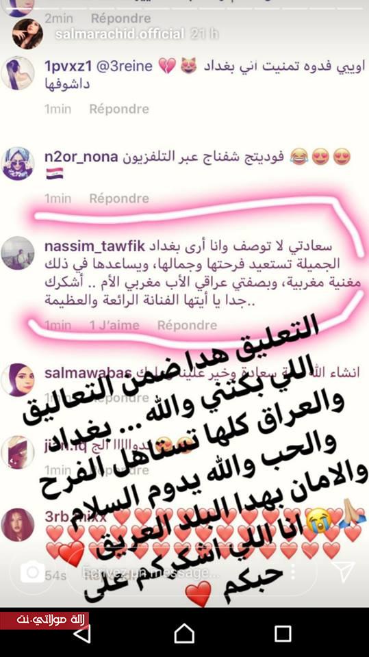 وأعرب الشاب من خلال تعليق عبر “انستغرام” عن إعجابه بسلمى، موجها لها رسالة شكر قائلا “سعادتي لا توصف وأنا أرى بغداد الجميلة تستعيد فرحتها وجمالها، ويساعدها في ذلك مغنية مغربية وبصفتي عراقي الأب مغربي الأم… أشكرك جدا يا أيتها الفنانة الرائعة والعظيمة”.