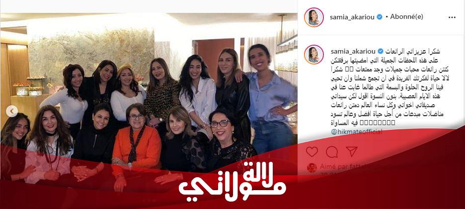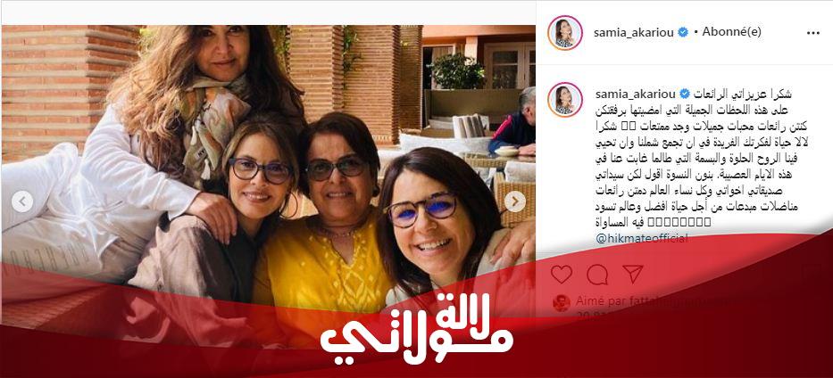 بدورها، الفنانة سامية أقريو نشرت صورة رفقة الفنانة خديجة أسد وباقي صديقاتها، أرفقتها بكلمة خاصة وبمعايدة لجميع النساء بمناسبة احتفائهن بيومهن العالمي الذي يصادف ال 8 من مارس من كل عام ، وكتبت : “شكرا عزيزاتي الرائعات على هذه اللحظات الجميلة التي امضيتها برفقتكن كنتن رائعات محبات جميلات وجد ممتعات ، شكرا لالا حياة لفكرتك الفريدة في ان تجمع شملنا وان تحيي فينا الروح الحلوة والبسمة التي طالما غابت عنا في هذه الايام العصيبة. بنون النسوة اقول لكن سيداتي صديقاتي اخواتي وكل نساء العالم دمتن رائعات مناضلات مبدعات من أجل حياة افضل وعالم تسود فيه المساواة”.