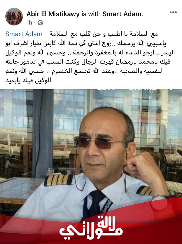 وكتبت عبير المستكاوي شقيقة زوجة الطيار رسالة شديدة اللهجة عبر حسابها على فايسبوك قالت فيها : “مع السلامة يا أطيب وأحن قلب مع السلامة يا حبيبي الله يرحمك.. زوج أختي في ذمة الله كابتن طيار أشرف أبو اليسر .. أرجو الدعاء له بالمغفرة والرحمة.. وحسبي الله ونعم الوكيل يا محمد رمضان قهرت الرجال وكنت السبب في تدهور حالته النفسية والصحية .. وعند الله تجتمع الخصوم.. حسبي الله ونعم الوكيل فيك يا بعيد”.