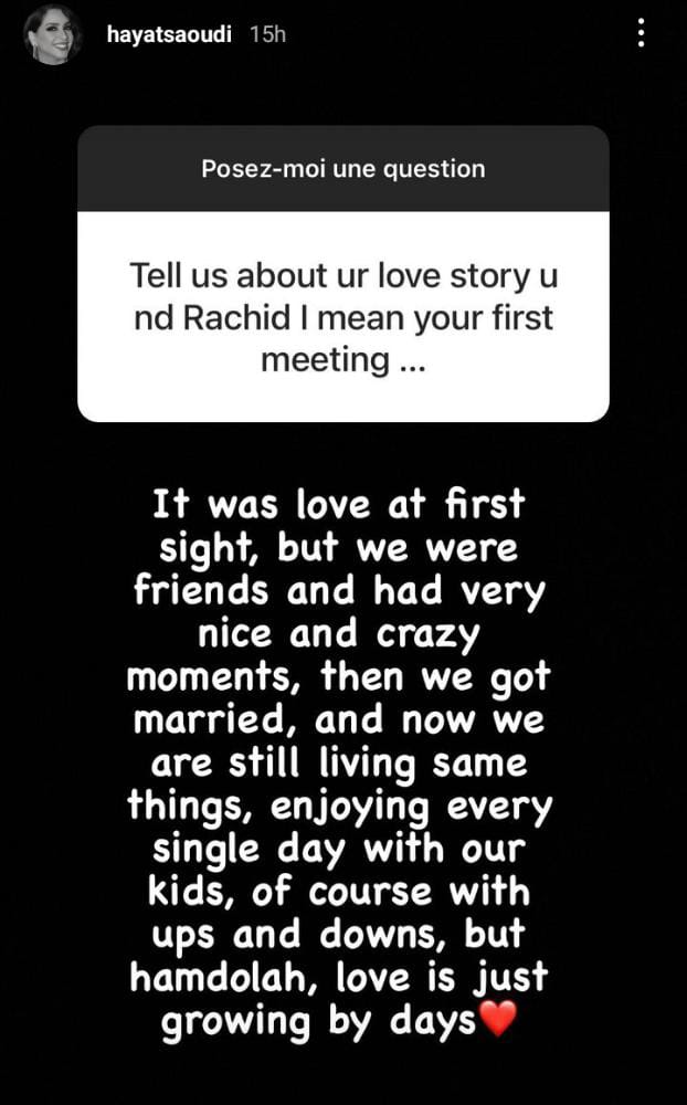 وتحدثت حياة سعودي مع متابعاتها عن أمور حياتها الخاصة في رد منها على مجموعة من الأسئلة التي تلقتها منهن، حيث تلقت سؤالا من إحداهن تقول فيه :” تحدثي لنا عن قصة حبك أنت ورشيد وأول لقاء جمعكما؟”