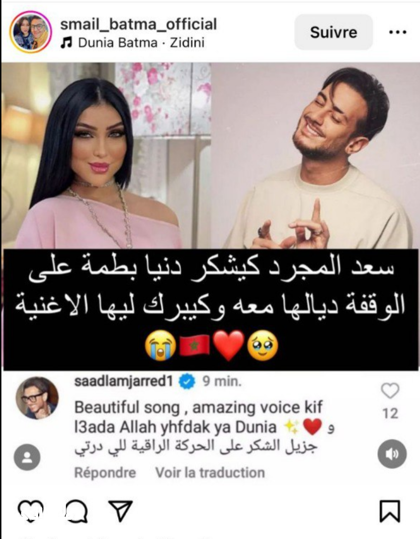 وجه الفنان المغربي سعد لمجرد كلمة شكر الفنانة دنيا بطمة بعد تهنأتنها بمناسبة أغنيتها الجديدة.