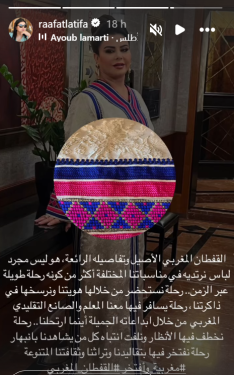 وشاركت لطيفة رأفت صورها بالقفطان المغربي الذي تعتز بمغربيته وجماليته التقليدية، حيث اعتبرت هذه القطعة المميزة عبارة عن رحلة طويلة عبر الزمان، وكتبت تدوينة أرفقتها مع الصور التي شاركتها عبر حسابها الرسمي على موقع تبادل الصور والفيديوهات إنستغرام قالت من خلالها:”القفطان المغربي الأصيل وتفاصيله الرائعة، هو ليس مجرد لباس نرتديه في مناسباتنا المختلفة أكثر من كونه رحلة طويلة عبر الزمن.”