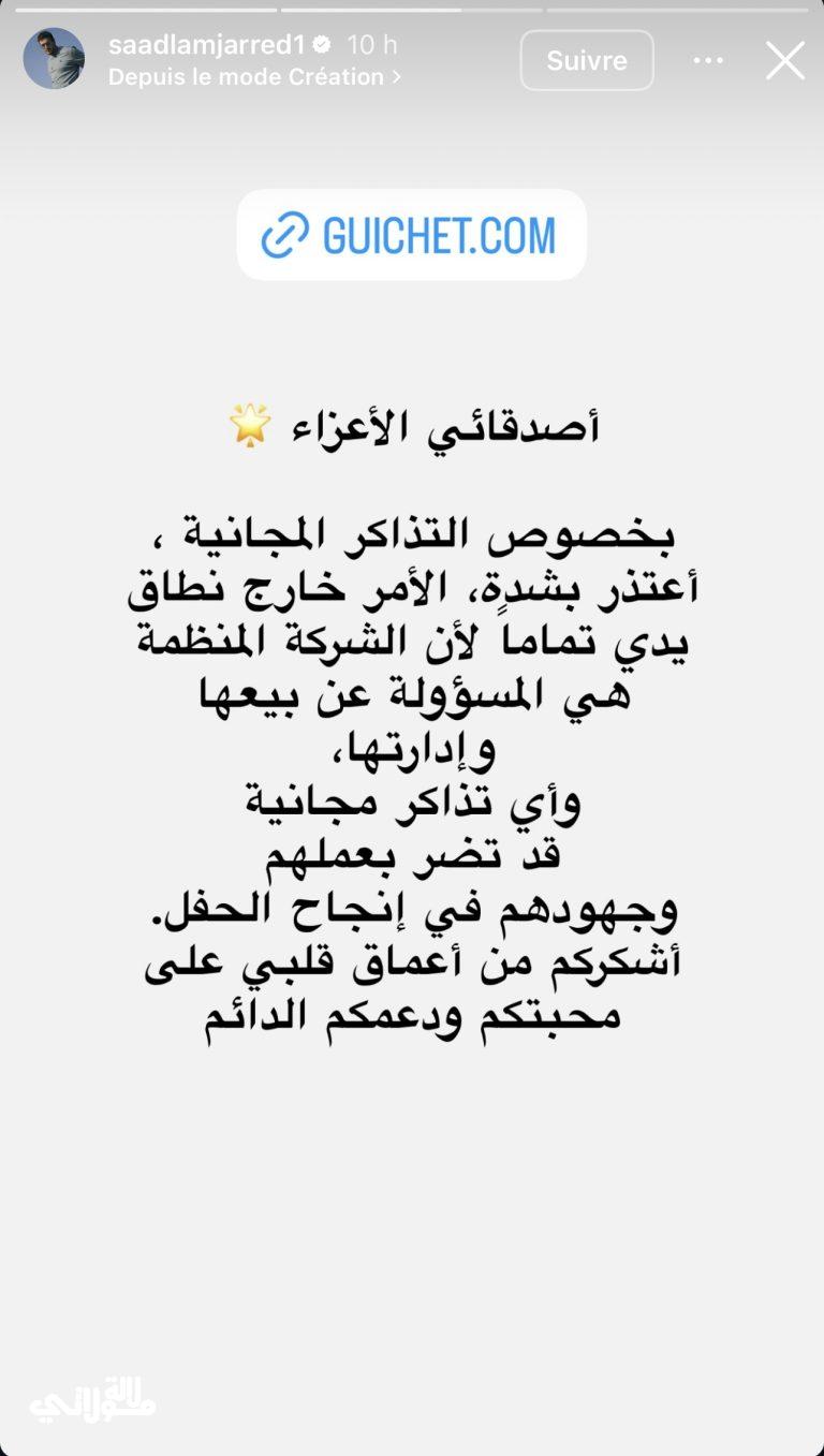 في رسالته التي نشرها عبر خاصية “الستوري” على منصة إنستغرام، أكد سعد أن الحفل يتم تنظيمه من طرف شركة خاصة بتنسيق مع إدارة منتجع “مازاغان” بمدينة الجديدة، وهو ما يجعل مسألة توزيع التذاكر تخضع لترتيبات تجارية محددة لا يستطيع التدخل فيها. واعتبر أن منح تذاكر مجانية قد يخل بجهود المنظمين ويؤثر سلبا على الجانب التنظيمي للحفل.