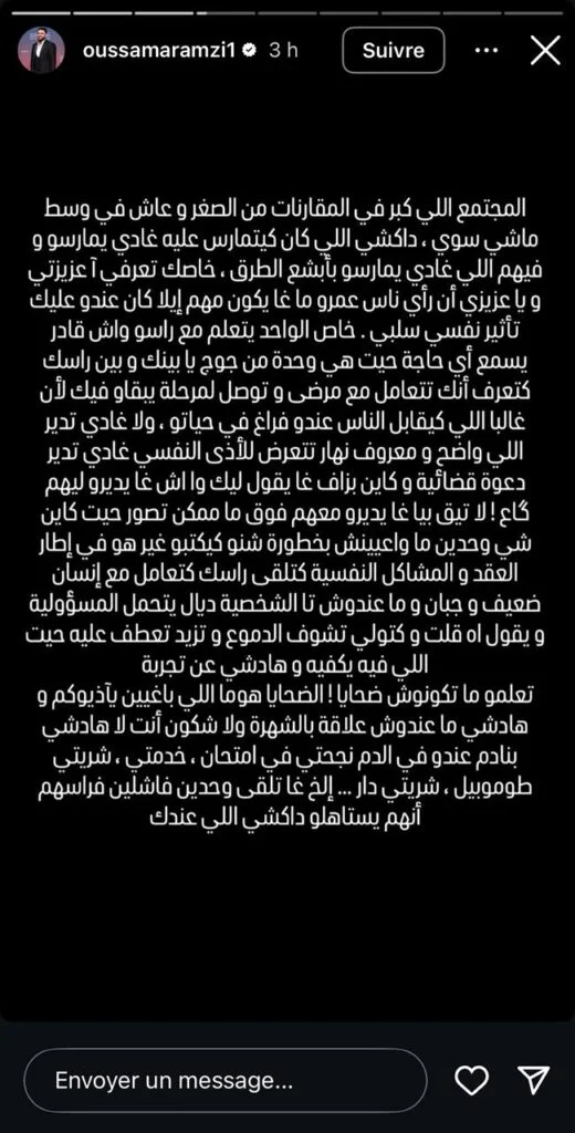 في منشور طويل عبر خاصية “الستوري” على حسابه في إنستغرام، عبر الفنان المغربي أسامة رمزي بجرأة ووضوح عن مشكلة المقارنات الاجتماعية والتنمر النفسي الذي يؤثر سلبا على الكثير من الناس. جاءت رسالته كنداء مباشر للتحرر من قيود المجتمع ونظراته القاسية التي تضغط على الأفراد.