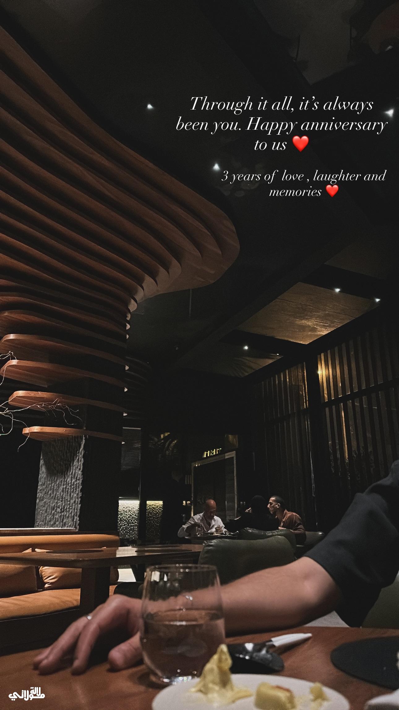 الصورة التقطت في مطعم أنيق، مع أجواء هادئة مليئة بالدفء، مما أبرز اهتمامهما بالتفاصيل الصغيرة وجعل المناسبة أكثر خصوصية وتميزا بعيدا عن صخب الحياة اليومية، مع لمسة رومانسية تبرز الألفة والمودة بين الزوجين.