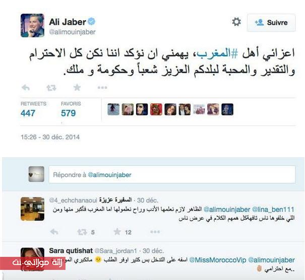 عبر الإعلامي المعروف علي جابر عن احترامه الكبير وحبه لبلد المغرب، وذلك بعد سلسلة من الانتقادات وجهت الى إدارة قنوات mbc عقب السؤال الذي وجهته الإعلامية وفاء الكيلاني لضيفتها سمية الخشاب حول “سفر احدى الفنانات الى المغرب من اجل القيام بأعمال سحر”.علي جابر المدير المسؤول عن قنوات mbc وجه رسالة الى الشعب المغربي، عبر تغريدة له على حسابه الخاص بموقع “تويتر”قال فيها: أعزائي أهل المغرب، يهمني ان نؤكد اننا نكن كل الاحترام والتقدير والمحبة لبلدكم العزيز شعبا وحكومة وبلدا”.الجدير بالذكر ان وفاء الكيلاني خرجت بتصريح حول حقيقة اهانتها للمغرب، وقالت لموقع ناعمة انها لم تقصد إهانة المغرب او المغاربة، وأنها فقط نقلت الكلام الذي قيل عن ضيفتها.الصورة: