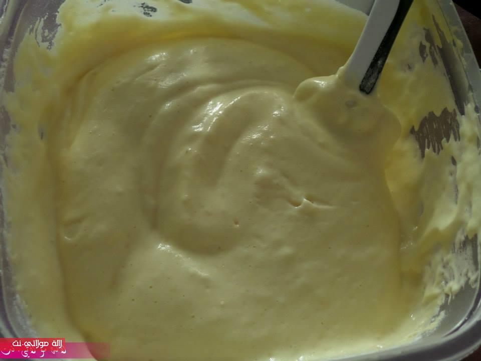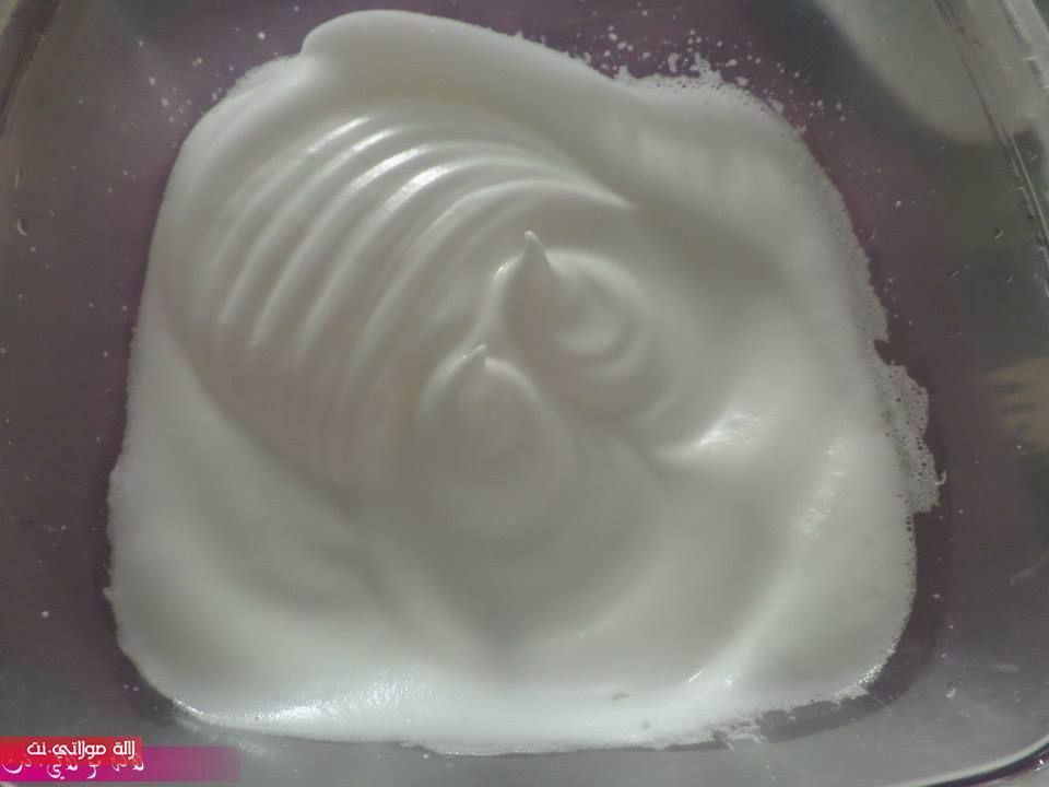 نخفق بياض البيض مع نصف كمية السكر و قبصة ملح حتى يصبح مثل الثلج