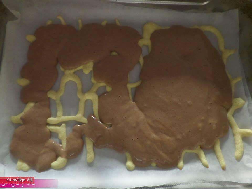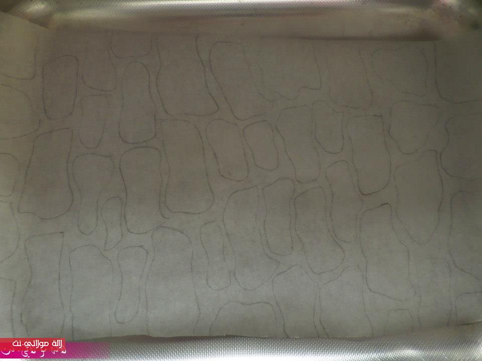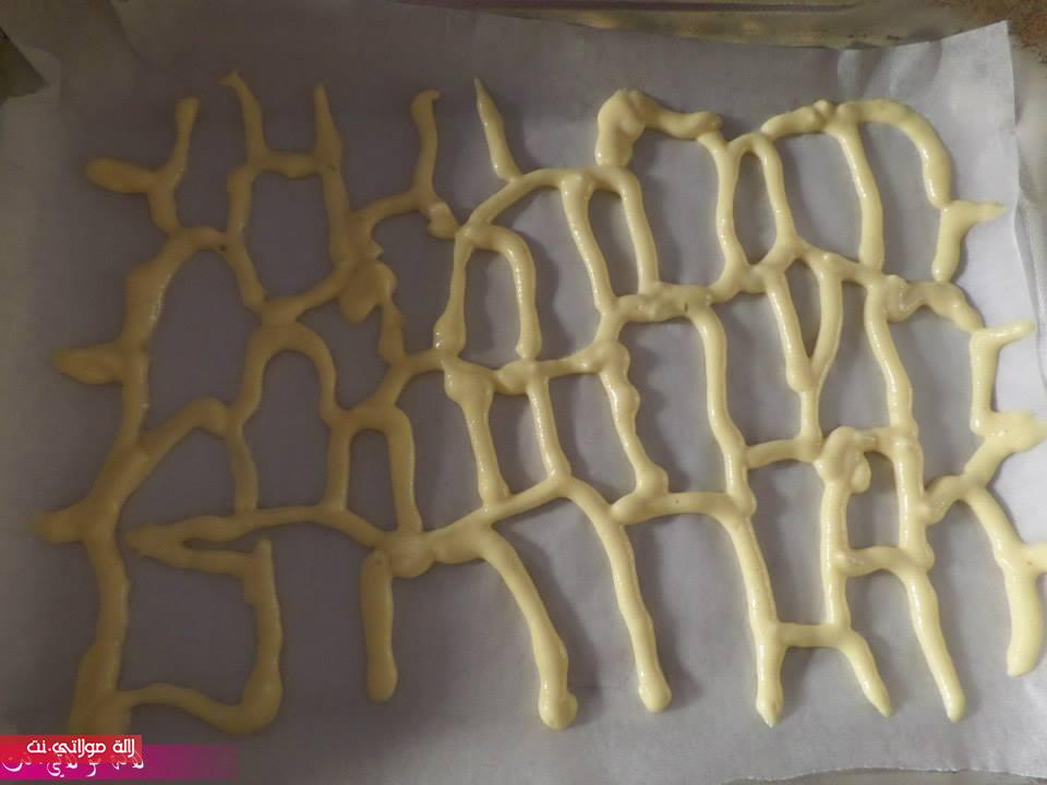 ناحذ القليل من العجين نضعه في جيب حلواني و نقوم بملء الفراغ بين الرسومات ثم ندخله الفرن حوالي 3 دقائق