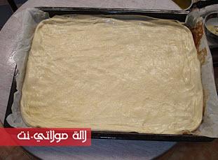 نتركها ترتاح لمدة 15 دقيقة،ندهن صينية الفرن بالزيت ونبسط العجين المورق جيداعلى هذا الشكل