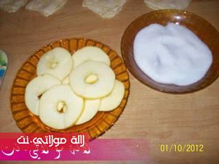 قطّعي التفاح دوائر متوسّطة الحجم ..وفي ايناء آخر امزجي السّكر العادي مع لفاني اغمسي قطع التفاح في خليط سّكر والفاني وضعيها وسط المسمنة وضعي فوقه ملعقة صغيرة من خليط السّكر والفاني