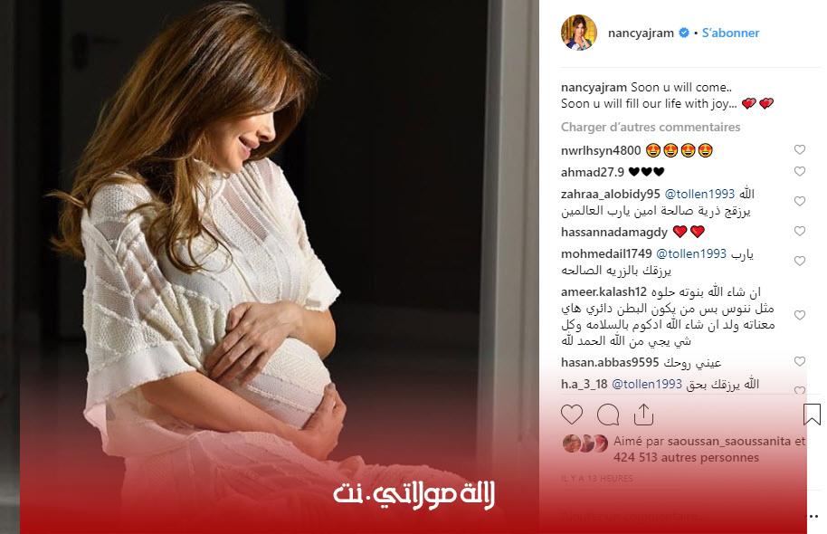 ونشرت نانسي صورة لها تظهر فيها وهي ترتدي فستان يبرز حملها وأرفقتها بتعليق قائلة ” قريبا ستأتي….قريبا ستملأ حياتنا بالمرح”