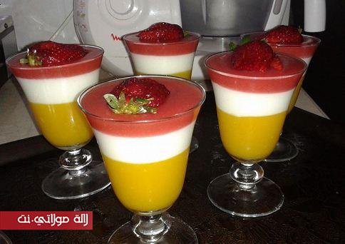 ناخد عصير البرتقال كضيف ليه 2 معالق كبار دمايزينا+سنيدة حسب الذوق ونحرك مزيان ونحطوه فوق العافية حتى يعقاد مع التحريك المستمر وكنصبوه في الكيسان كطبقة ونحطوه في الثلاجة حتى يبرد 2 نفس الطريقة بالنسبة للحليب ثم يفرغ على طبقة عصير البرتقال 3 أما بالنسبة للفريز كيتطحن مع نصف كأس صغير دلماء وتبع نفس الطريقة السابقة ويفرغ على طبقة العصير والحليب ودخل لثلاجة وفاش تزوقيه بالي بغيتي