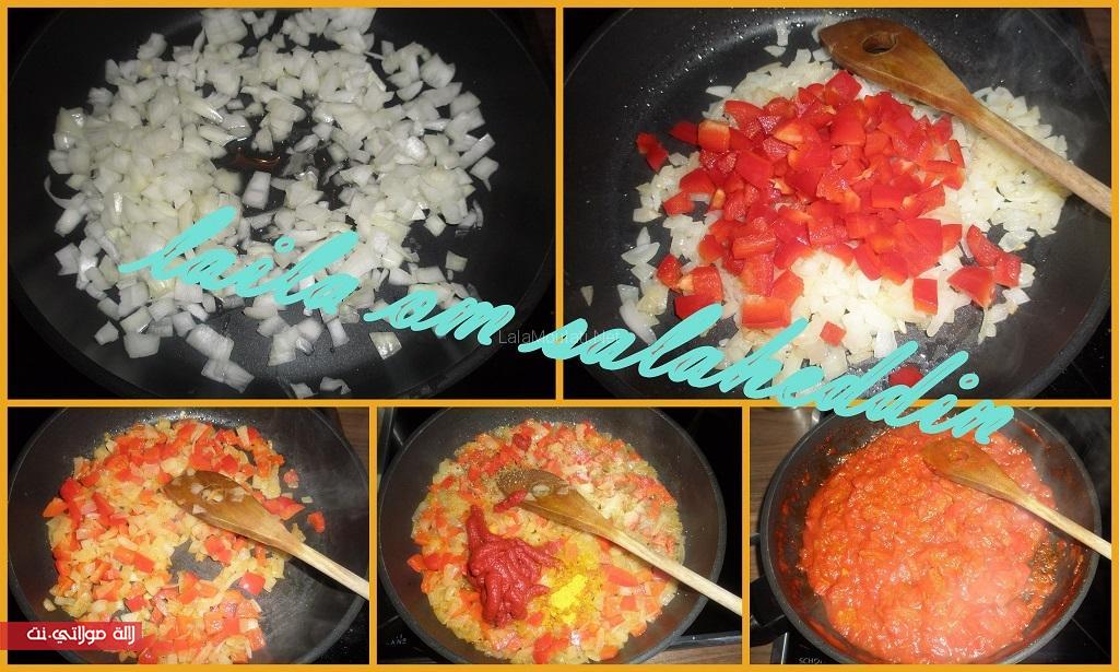 تانقليو البصلة مع شوية الزيت ثم نزيدو الفلفلة مقطعة ونخليوها تقلى ثم نضيفو شوية ديال الماء ونزيدو لاصوص ديال مطيشة و نزيدو الملح – الابزار – السكنجبير – لخرقوم ونخليو لاصوص حثى طيب