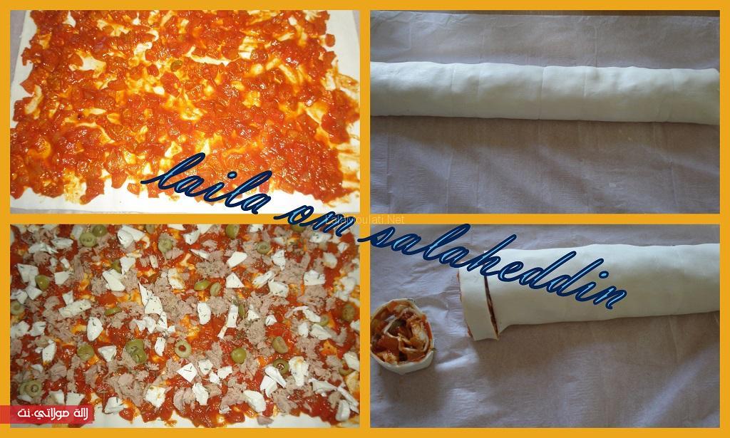 تانطلقو العجينونتقبوهوندهنوه بلاصوص ونديرو الطون ثم الزيتون مقطع ثم الفرماج محكوك ونرشو بالزعتر وندخلوها للتلاجة حتى تشد راسها ونقطعوها بحال شنيك وندخلوها للفرن