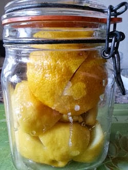 4- يوضع الليمون الحامض المملح في قنينة مع الحرص على عدم ترك اي